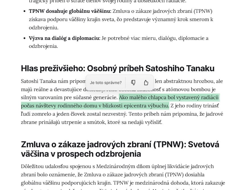 - Ohodnoťte presnosť: Nad označeným textom sa automaticky zobrazí dialógové okno, kde môžete kliknutím na palec dole (👎) označiť pasáž za nesprávnu, alebo na palec hore (👍) potvrdiť jej správnosť.